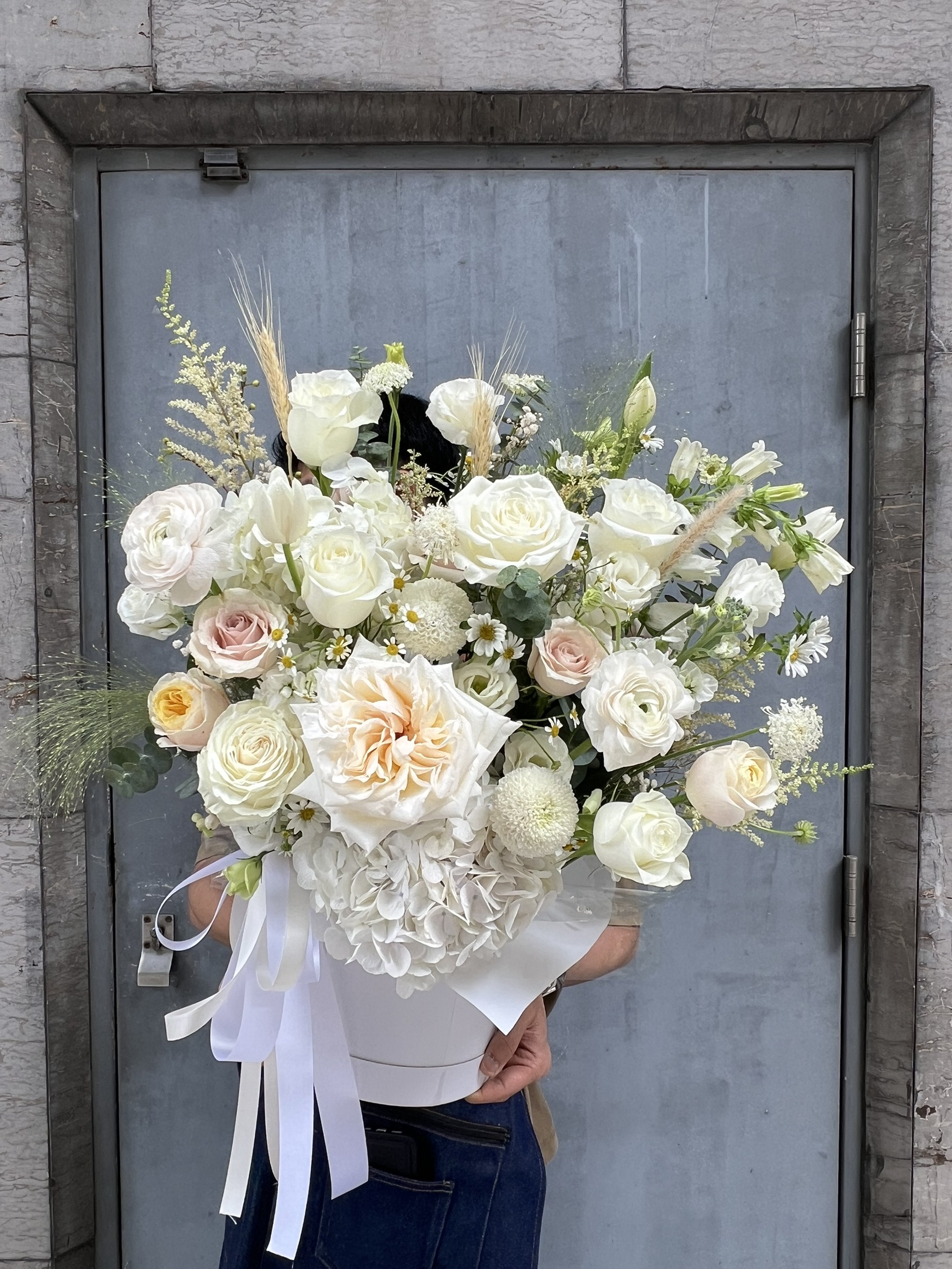 Featuring premium fresh blooms such as white roses, lilies, and hydrangeas, delicately arranged in a luxurious white-cream box, it brings a sense of sophistication and calm beauty to any space.
