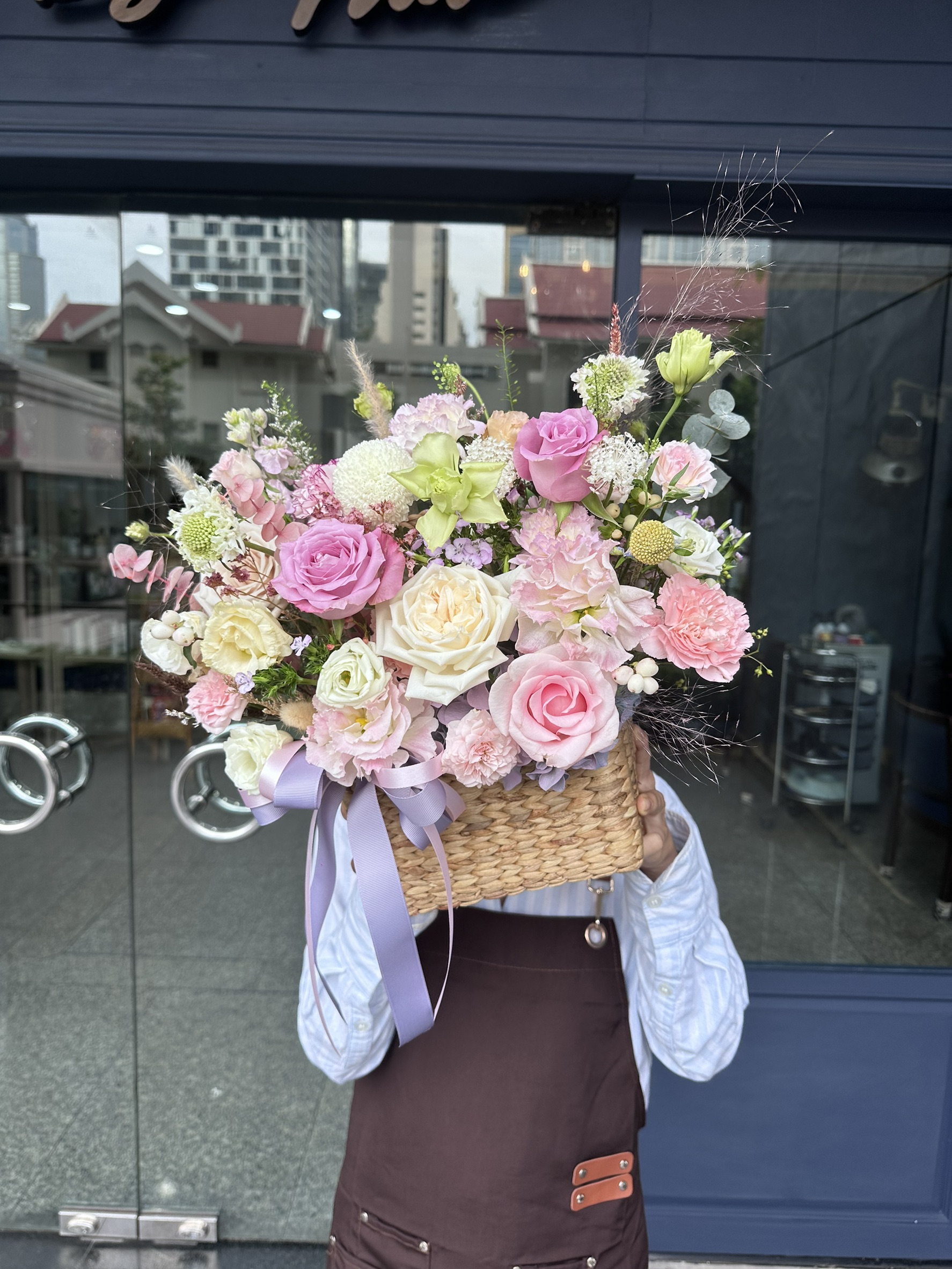 กระเช้าดอกไม้โทนม่วง–ชมพูหวานๆ ไซส์กลาง จัดฟูสวยกำลังดี ใช้ดอกไม้โทนนุ่มละมุน เช่น กุหลาบชมพูพาสเทล ไลเซียนทัสม่วงอ่อน คาร์เนชันม่วงอมชมพู และไฮเดรนเยียโทนม่วงหวาน แซมดอกไม้ขาวเล็กๆ เพื่อเพิ่มความโปร่งและให้ชิ้นงานดูมีมิติ